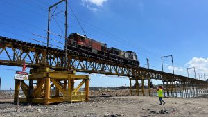 A las 10.00 horas se iniciaronlas pruebas de carga estáticas con el paso de locomotoras de 54,5 y 72 toneladas de peso. El proceso será monitoreado en línea gracias a los sensores dispuestos en toda la estructura.