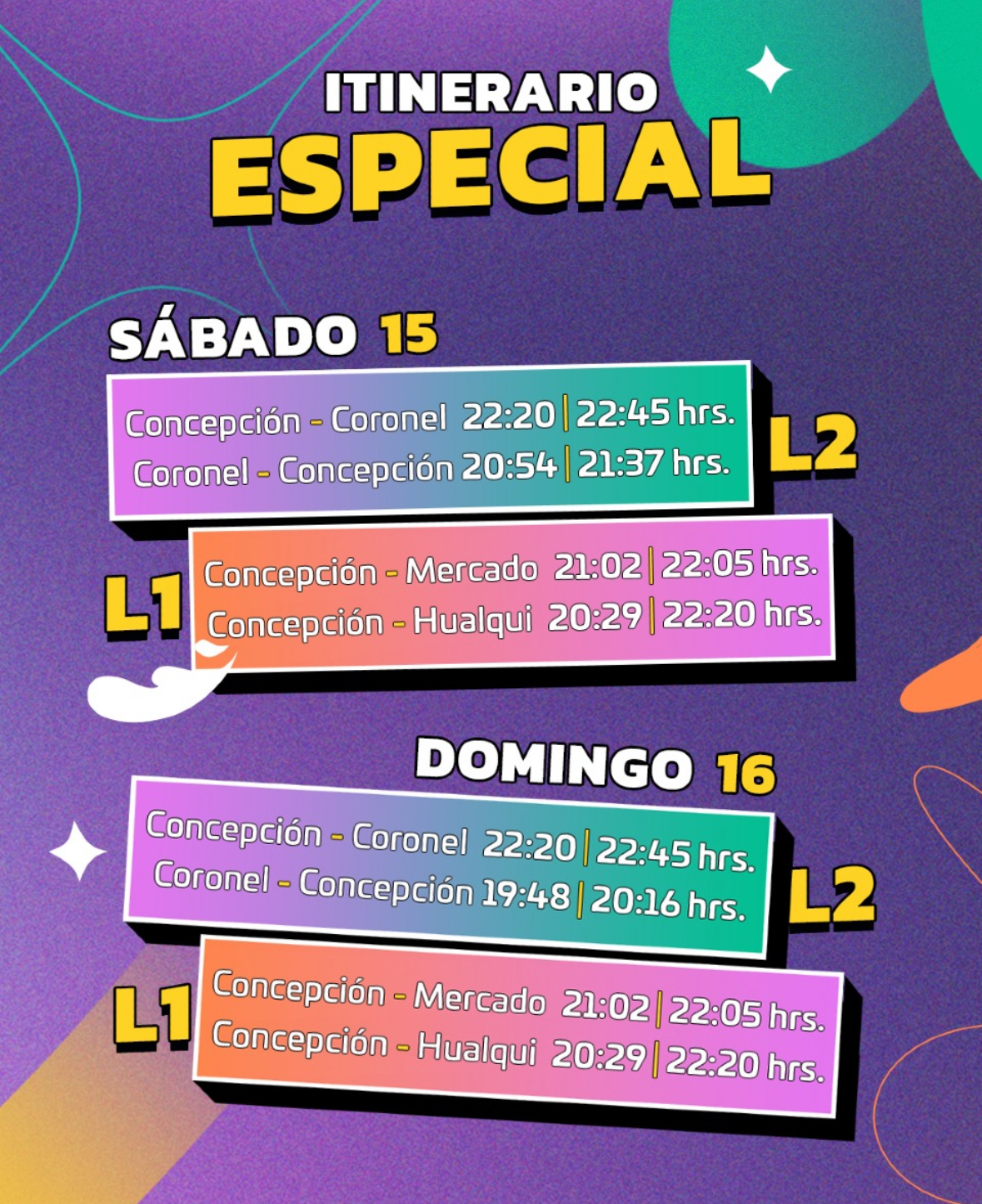 Para la jornada del domingo, son seis los viajes que reforzarán el itinerario habitual del Biotren, con salidas a las 19:30hrs, 22:20hrs y 22:45hrs desde Concepción a Coronel; y a las 18:44hrs, 19:48hrs y 20:16hrs para el tramo Coronel – Concepción.