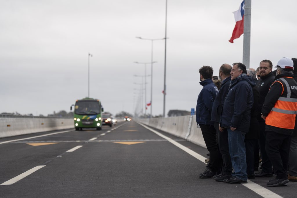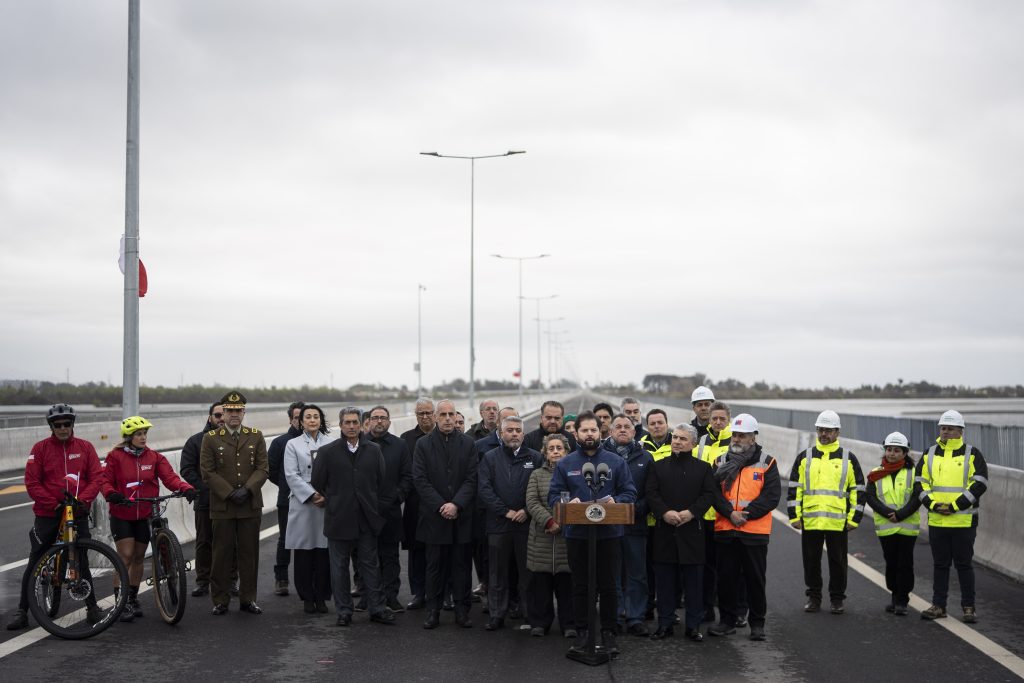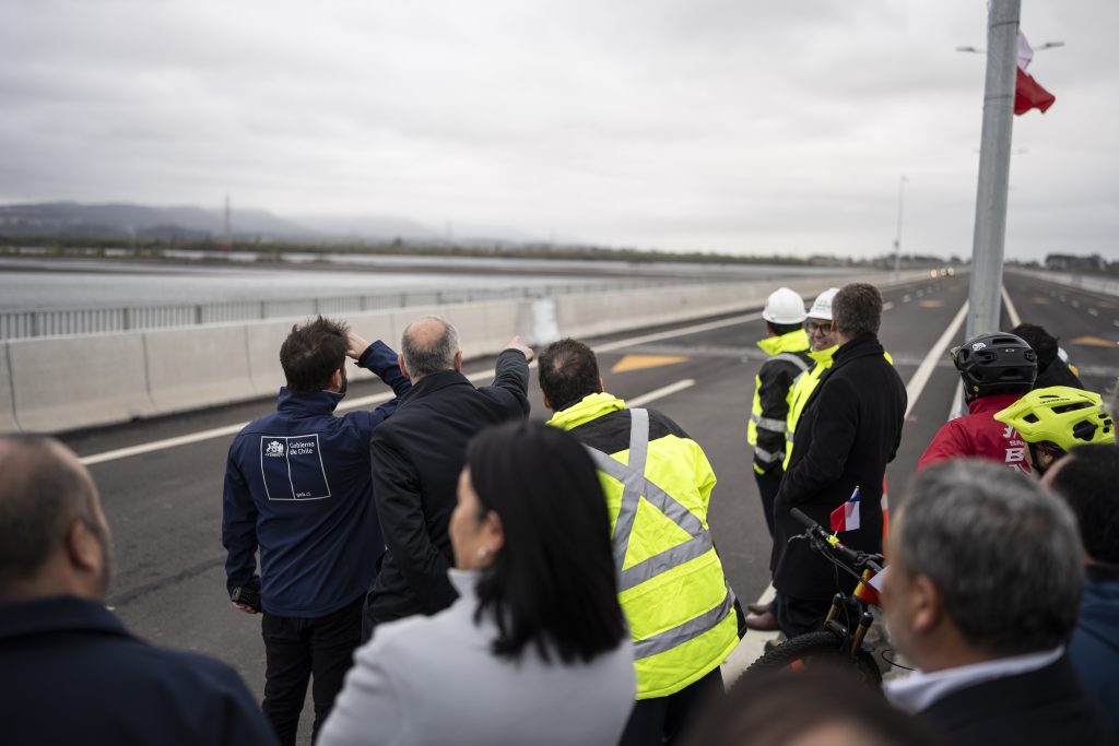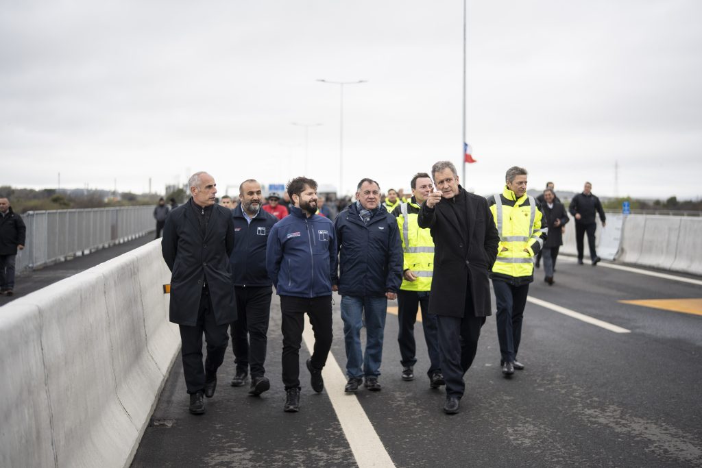 El Presidente de la República, Gabriel Boric Font, encabezo el hito de apertura para la puesta en marcha del Puente Industrial, nueva conexión vial entre las comunas de San Pedro de la Paz y Hualpén en la Región del Biobío, junto a la ministra de Obras Públicas, Jessica López; el ministro de Transportes y Telecomunicaciones, Juan Carlos Muñoz; el gobernador de la Región del Biobío, Sergio Giacaman; el delegado presidencial regional del Biobío, Eduardo Pacheco; el presidente de la Asociación de Municipalidades de la Región del Biobío y alcalde de Hualqui, Ricardo Fuentes; el alcalde de San Pedro de la Paz, Juan Pablo Spoerer; y el alcalde de Hualpén, Miguel Rivera.