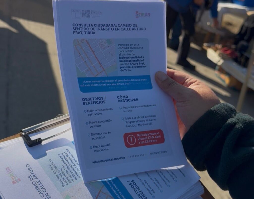 Por su parte, el alcalde de Tirúa, José Linco Garrido, hizo un llamado a sumarse a la consulta: “La calle Arturo Prat es el corazón de nuestra comuna, donde se desarrolla gran parte del comercio y la vida diaria. Queremos que este tipo de decisiones se construyan con la comunidad, por eso invitamos a todas y todos a participar y ser parte de este proceso”.
